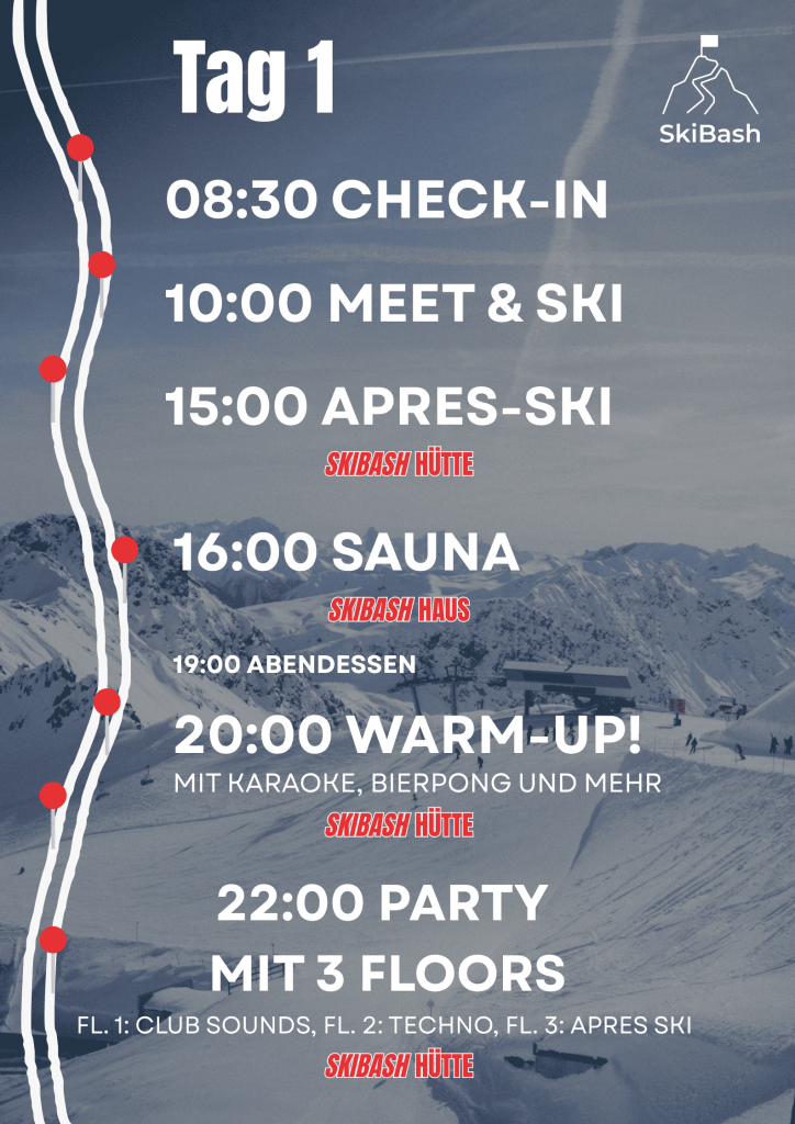 SkiBash ist dein perfekt organisiertes und absolut preiswertes Ski- und Partywochenende im Schnee. Ob allein, zu zweit oder mit deiner ganzen Studi-Crew – wir kümmern uns um alles.